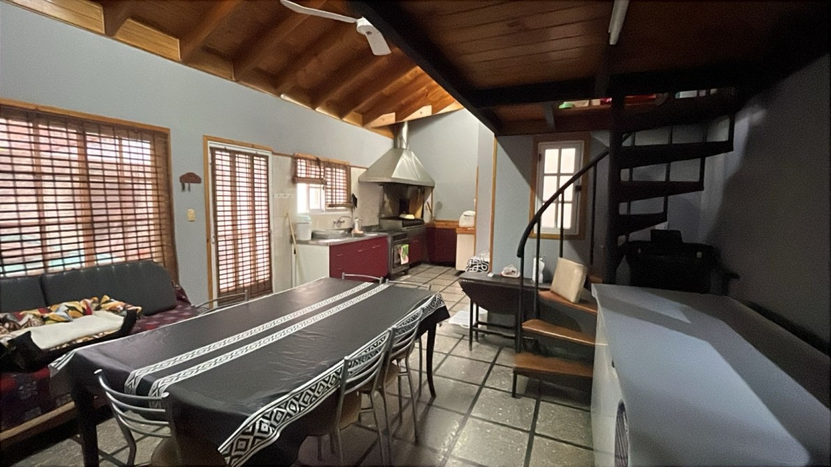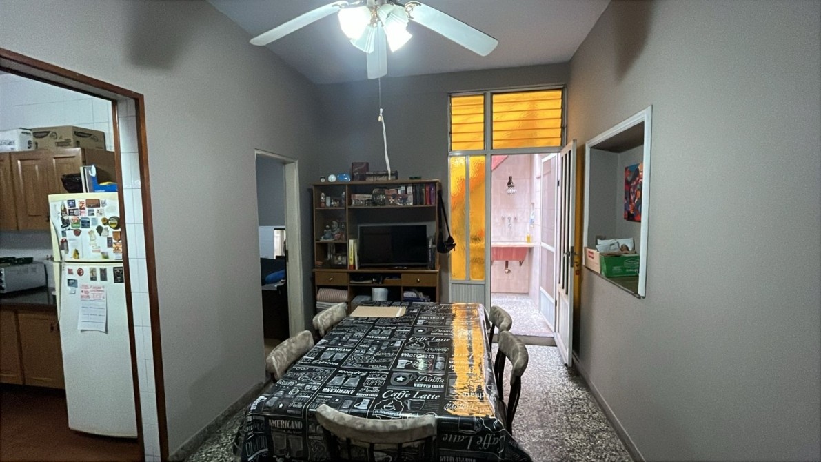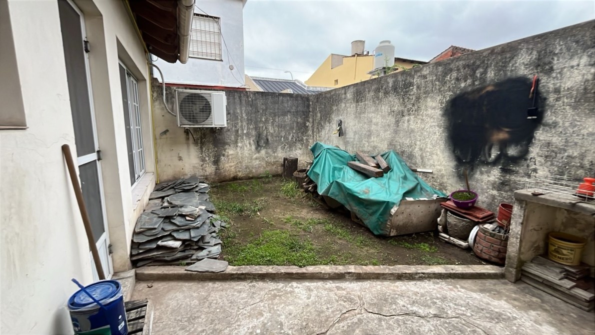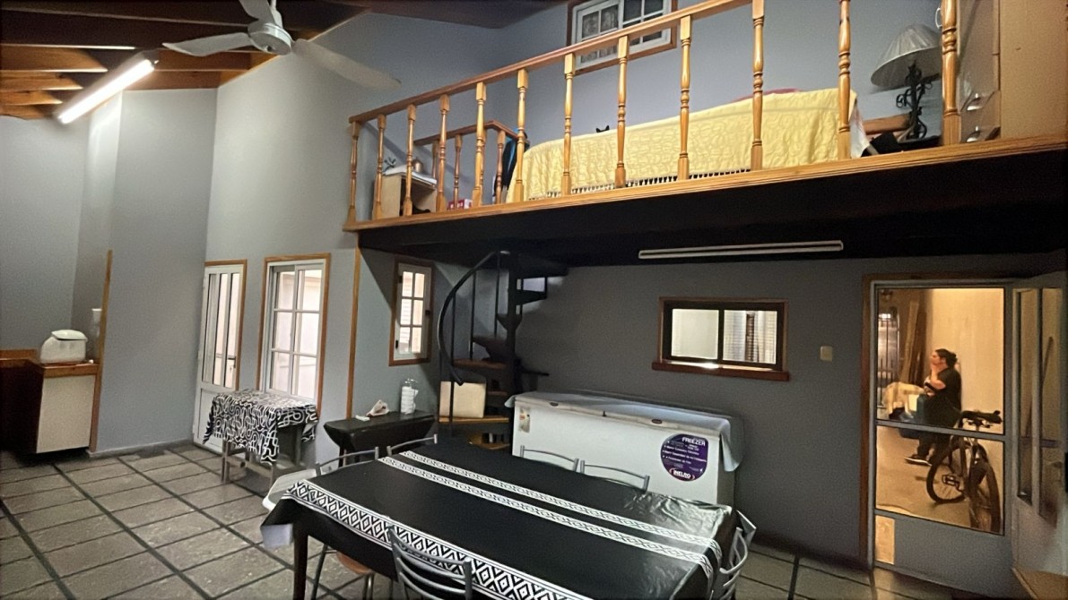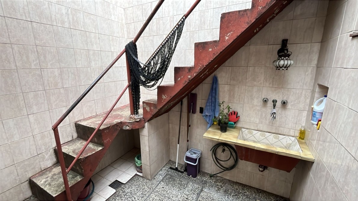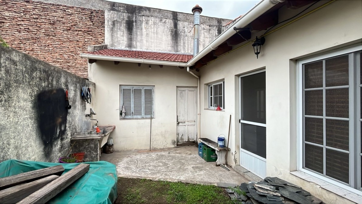Jardin con rejas. Local al frente (ocupando lo que fuera el garage y un dormitorio). Recepción, biblioteca, baño, bajo escalera, comedor, patio interno con escalera terraza con lavadero, cocina bajos y alto mesada, dormitorio con baño en suite, patio interno, quincho (parrilla a gas y cocina) con entrepiso metálico y ambiente tipo dormitorio, fondo libre chico.